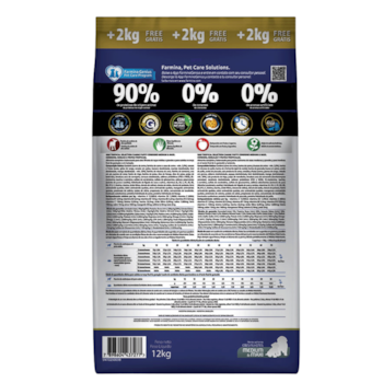 Cordeiro (carne de ovino, farinha de carne e osso de ovino – mín. 3,5%), cereais e frutas (aveia, grãos de sorgo, cevada em grãos, banana desidratada, mamão desidratado, kiwi desidratado, manga desidratada – mín. 35%), farinha de vísceras de aves, farinha de torresmo, ovo em pó, quirera de arroz, farelo de trigo, farinha de peixe, óleo de frango, óleo de peixe, polpa de beterraba, levedura seca de cervejaria, cenoura desidratada, aditivos prebióticos (FOS e MOS), DL-metionina, taurina, L-carnitina, sulfato de condroitina, sulfato de glicosamina, aditivos adsorventes (extrato de yucca e zeolita), hidrolisado de fígado de aves e suínos, vitaminas (A, D3, E, B1, B2, B5, B6, B12, C, biotina, niacina, ácido fólico, cloreto de colina), cloreto de sódio, cloreto de potássio, ferro aminoácido quelato, cobre aminoácido quelato, zinco aminoácido quelato, manganês aminoácido quelato, proteinato de selênio, iodato de cálcio, propionato de cálcio, concentrado de tocoferóis. Eventuais substitutivos: proteína hidrolisada de peixe, proteína hidrolisada de frango.