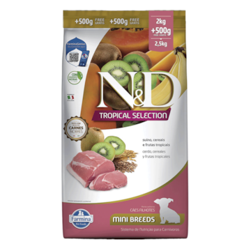 Ração N&D Tropical Selection Cães Filhotes 2kg + 500g Grátis Porte Mini e Pequeno Sabor Suíno, Cereais e Frutas Tropicais