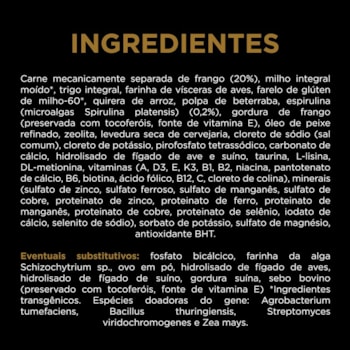 Carne mecanicamente separada de frango (20%), milho integral moído*, trigo integral, farinha de vísceras de aves, farelo de glúten de milho-60*, quirera de arroz, polpa de beterraba, espirulina (microalgas Spirulina platensis) (0,2%), gordura de frango (preservada com tocoferóis, fonte de vitamina E), óleo de peixe refinado, zeolita, levedura seca de cervejaria, cloreto de sódio (sal comum), cloreto de potássio, pirofosfato tetrassódico, carbonato de cálcio, hidrolisado de fígado de ave e suíno, taurina, L-lisina, DL-metionina, vitaminas (A, D3, E, K3, B1, B2, niacina, pantotenato de cálcio, B6, biotina, ácido fólico, B12, C, cloreto de colina), minerais (sulfato de zinco, sulfato ferroso, sulfato de manganês, sulfato de cobre, proteinato de zinco, proteinato de ferro, proteinato de manganês, proteinato de cobre, proteinato de selênio, iodato de cálcio, selenito de sódio), sorbato de potássio, sulfato de magnésio, antioxidante BHT. Eventuais substitutivos: fosfato bicálcico, farinha da alga Schizochytrium sp., ovo em pó, hidrolisado de fígado de aves, hidrolisado de fígado de suíno, gordura suína, sebo bovino (preservado com tocoferóis, fonte de vitamina E) *Ingredientes transgênicos. Espécies doadoras do gene: Agrobacterium tumefaciens, Bacillus thuringiensis, Streptomyces viridochromogenes e Zea mays.