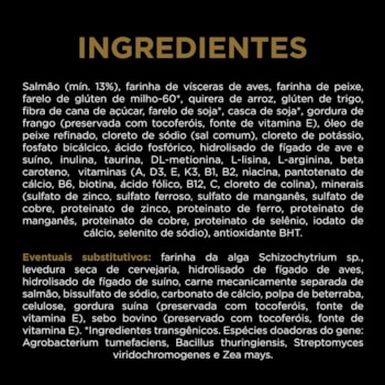 Salmão (mín. 13%), farinha de vísceras de aves, farinha de peixe, farelo de glúten de milho-60*, quirera de arroz, glúten de trigo, fibra de cana de açúcar, farelo de soja*, casca de soja*, gordura de frango (preservada com tocoferóis, fonte de vitamina E), óleo de peixe refinado, cloreto de sódio (sal comum), cloreto de potássio, fosfato bicálcico, ácido fosfórico, hidrolisado de fígado de ave e suíno, inulina, taurina, DL-metionina, L-lisina, L-arginina, beta caroteno, vitaminas (A, D3, E, K3, B1, B2, niacina, pantotenato de cálcio, B6, biotina, ácido fólico, B12, C, cloreto de colina), minerais (sulfato de zinco, sulfato ferroso, sulfato de manganês, sulfato de cobre, proteinato de zinco, proteinato de ferro, proteinato de manganês, proteinato de cobre, proteinato de selênio, iodato de cálcio, selenito de sódio), antioxidante BHT. Eventuais Substitutivos: farinha da alga Schizochytrium sp., levedura seca de cervejaria, hidrolisado de fígado de aves, hidrolisado de fígado de suíno, carne mecanicamente separada de salmão, bissulfato de sódio, carbonato de cálcio, polpa de beterraba, celulose, gordura suína (preservada com tocoferóis, fonte de vitamina E), sebo bovino (preservado com tocoferóis, fonte de vitamina E). *Ingredientes transgênicos. Espécies doadoras do gene: Agrobacterium tumefaciens, Bacillus thuringiensis, Streptomyces viridochromogenes e Zea mays. Enriquecimento por kg de produto (mín): Vitaminas: D3 (1.000UI), K3 (0,1 mg), B1 (50 mg), B2 (16 mg), B3 (150) mg), B5 (30 mg), B6 (12 mg), B7 (0,2 mg), B9 (3,5 mg), B12 (80 µg), Colina (1.000 mg). Minerais: Zinco (110 mg), Ferro (110mg), Manganês (35 mg), Cobre (8 mg), Iodo (1 mg), Selênio (0,1 mg).