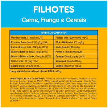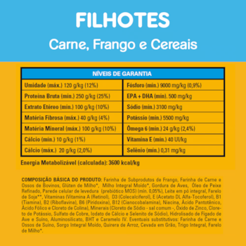 Farinha de Subprodutos de Frango, Farinha de Carne e Ossos, Glúten de Milho*, Milho Integral Moído*, Gordura de Frango, Leite Integral em Pó, Farelo de Soja**, Triptofano, Vitaminas (A, D3, E, B1, B2, B6, B12, Niacina, Ácido Pantotênico, Ácido Fólico, Biotina e Cloreto de Colina), Minerais (Cloreto de Sódio - sal comum -, Óxido de Zinco, Cloreto de Potássio, Sulfato de Cobre, Sulfato de Ferro, Iodato de Cálcio, Selenito de Sódio e Fosfato Bicálcico), Hidrolisado de Fígado de Ave e Suíno, Aluminosilicato, B.H.T (Hidróxido de Tolueno Butilado), Corante Natural Caramelo. Eventuais substitutivos: Sorgo Integral Moído, Quirera de Arroz, Cevada em Grão, Trigo Integral e Óleo de Peixe Refinado. *Espécies doadoras do gene: Agrobacterium tumefaciens, Bacillus thuringiensis, Streptomyces viridochromogenes, Zea mays, Sphingobium herbicidorovans, Dicossoma sp., Diabrotica firgifera, Thermoccocales spp, Bacillus substilis. **Espécies doadoras do gene: Agrobacterium tumefaciens, Bacillus thuringiensis, Streptomyces viridochromogenes, Arabidopsis thaliana, Delftia acidovorans, Pseudomonas fluorescens, Zea mays, Stenotrophomonas maltophilia, B.T. var Azawai e Kurstaqui, Agrobacterium sp.