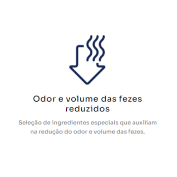 - Ingredientes especiais que reduzem o odor e o volume das fezes, melhorando a higiene do ambiente.