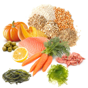 Farinha de milho, Farinha de peixe, Farinha de trigo, Farinha de camarão desidratado, Farinha de alga Schizochytrium sp, Proteína hidrolisada de soja, Biomassa de micro algas, Spirulina platensis, Cantaxantina, Astaxantina, Vitamina A, Vitamina D3, Vitamina E, Vitamina C.