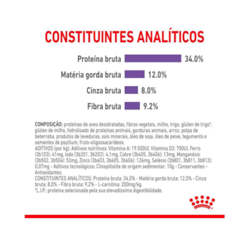 Farinha de vísceras de aves, milho moído*, fibra de soja*, farinha de torresmo, fibra de ervilha, farelo de glúten de milho*, quirera de arroz, farinha de trigo, gordura de frango, polpa desidratada de beterraba, levedura de cervejaria inativada desidratada, glúten de trigo, óleo de soja refinado*, óleo branqueado e desodorizado de peixes, casca de psyllium, cloreto de sódio (sal comum), cloreto de potássio, fosfato monocálcico, frutooligossacarídeos, zeolita, retinol (vitamina A), ácido ascórbico (vitamina C), colecalciferol (vitamina D3), acetato de dl-alfa tocoferol (vitamina E), cloridrato de tiamina (vitamina B1), riboflavina (vitamina B2), cloridrato de piridoxina (vitamina B6), cianocobalamina (vitamina B12), ácido nicotínico (niacina), D-pantotenato de cálcio, biotina, ácido fólico, cloreto de colina, sulfato de cálcio, sulfato de ferro, sulfato de cobre, óxido de zinco, óxido de manganês, iodato de cálcio, levedura enriquecida com selênio, zinco aminoácido quelato, manganês aminoácido quelato, cobre aminoácido quelato, DL-metionina, taurina, L-carnitina, hidrolisado de fígado de aves, antioxidante BHA (butilhidroxianisol).