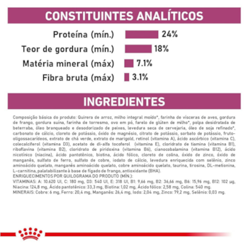 Quirera de arroz, farinha de vísceras de aves, milho integral moído*, gordura de frango, gordura suína, ovo em pó, farinha de torresmo, farelo de glúten de milho*, polpa de beterraba, óleo de peixe refinado, levedura seca de cervejaria, óleo de soja refinado*, cloreto de potássio, carbonato de cálcio, citrato de potássio, fruto-oligossacarídeos, extrato de chá verde, extrato de marigold, sorbato de potássio, vitaminas (C, E, A, D3, B1, B2, B6, B12, PP), ácido pantotênico, biotina, ácido fólico, cloreto de colina, óxido de magnésio, óxido de manganês, óxido de zinco, sulfato de cobre, sulfato de ferro, iodato de cálcio, levedura enriquecida com selênio, cobre aminoácido quelato, manganês aminoácido quelato, zinco aminoácido quelato, L-arginina, taurina, DL-metionina, L-carnitina, tirosina, palatabilizante à base de fígado de frango, antioxidante (BHA).