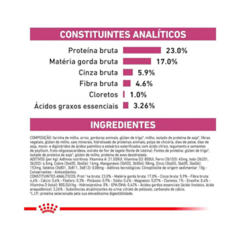 Quirera de arroz, milho moído*, glúten de trigo, farelo de glúten de milho*, gordura de frango, fibra de soja*, gordura suína, proteína isolada de soja*, polpa de chicória seca, óleo branqueado e desodorizado de peixes, óleo de soja refinado*, casca de psyllium, carbonato de cálcio, cloreto de potássio, cloreto de sódio (sal comum), citrato de potássio, frutooligossacarídeos, extrato de marigold (Tagetes erecta), zeolita, retinol (vitamina A), ácido ascórbico (vitamina C), colecalciferol (vitamina D3), acetato de dl-alfa tocoferol (vitamina E), cloridrato de tiamina (vitamina B1), riboflavina (vitamina B2), cloridrato de piridoxina (vitamina B6), cianocobalamina (vitamina B12), ácido nicotínico (niacina), D-pantotenato de cálcio, biotina, ácido fólico, cloreto de colina, óxido de zinco, óxido de manganês, sulfato de ferro, sulfato de cobre, iodato de cálcio, levedura enriquecida com selênio, zinco aminoácido quelato, manganês aminoácido quelato, cobre aminoácido quelato, L-arginina, DL-metionina, taurina, L-lisina, ésteres de ácido cítrico e ácidos graxos com glicerol, hidrolisado de fígado de aves, antioxidante BHA (butilhidroxianisol).