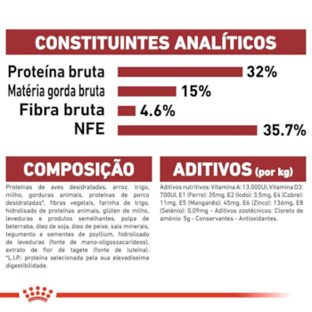 Farinha de vísceras de aves, quirera de arroz, farinha de torresmo, fibra de soja*, farinha de trigo, milho integral moído*, gordura suína, gordura de frango, levedura seca de cervejaria, polpa de beterraba, casca de psyllium, farelo de glúten de milho*, óleo de soja refinado*, óleo de peixe refinado, cloreto de sódio (sal comum), sulfato de cálcio, cloreto de potássio, fosfato monocálcico, parede celular de levedura (MOS), extrato de marigold, vitaminas (A, E, C, D3, B1, B2, B6, B12, PP), ácido pantotênico, biotina, ácido fólico, cloreto de colina, levedura enriquecida com selênio, sulfato de ferro, sulfato de cobre, óxido de manganês, óxido de zinco, iodato de cálcio, DL-metionina, taurina, palatabilizante à base de fígado de frango, antioxidante (BHA).