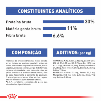 Farinha de vísceras de aves, milho integral moído*, quirera de arroz, aveia descascada, gordura de frango, polpa de beterraba, casca de ervilha, fibra de soja*, casca de psyllium, farelo de glúten de milho*, glúten de trigo, cloreto de sódio (sal comum), cloreto de potássio, óleo de peixe refinado, óleo de soja refinado*, óleo de borragem, carbonato de cálcio, levedura seca de cervejaria, extrato de chá verde, fruto-oligossacarídeos, sorbato de potássio, tripolifosfato de sódio, vitaminas (A, E, C, D3, B1, B2, B6, B12, PP), ácido pantotênico, biotina, ácido fólico, cloreto de colina, sulfato de ferro, sulfato de cobre, óxido de manganês, óxido de zinco, óxido de magnésio, iodato de cálcio, levedura enriquecida com selênio, cobre aminoácido quelato, manganês aminoácido quelato, zinco aminoácido quelato, taurina, L-lisina, DL-metionina, L-carnitina, palatabilizante à base de fígado de frango, antioxidante (BHA).