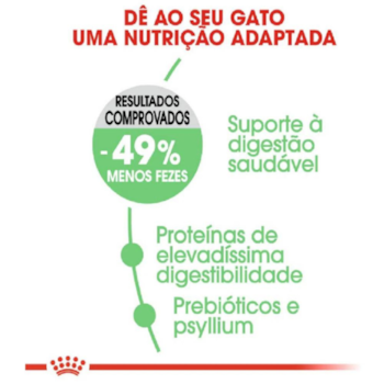 A Ração Royal Canin Digestive Care é desenvolvida especialmente para gatos adultos que apresentam sensibilidade digestiva, garantindo um cuidado completo e balanceado para manter a saúde intestinal e promover uma digestão ideal. Com uma fórmula de alta qualidade, este alimento contém nutrientes adaptados e um formato de croquete exclusivo que facilita a mastigação e a digestão, oferecendo uma experiência alimentar agradável e funcional para o seu gato. A Ração é formulada com uma combinação exclusiva de prebióticos e fibras naturais, como as cascas de sementes de psyllium, que auxiliam na manutenção do equilíbrio da flora intestinal e na regulação do trânsito intestinal.