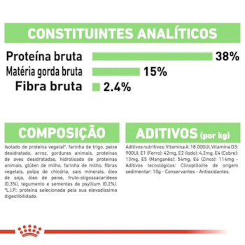 Farinha de vísceras de aves, glúten de trigo, quirera de arroz, farinha de mandioca, farinha de trigo, gordura suína, gordura de frango, farelo de glúten de milho*, fibra de soja*, polpa de chicória seca, casca de psyllium, óleo de peixe refinado, óleo de soja refinado*, sulfato de cálcio, cloreto de potássio, cloreto de sódio (sal comum), fosfato monocálcico, zeolita, fruto-oligossacarídeos, vitaminas (A, E, C, D3, B1, B2, B6, B12, PP), ácido pantotênico, biotina, ácido fólico, cloreto de colina, sulfato de ferro, iodato de cálcio, cobre aminoácido quelato, manganês aminoácido quelato, zinco aminoácido quelato, taurina, palatabilizante à base de fígado de frango, antioxidante (BHA).
