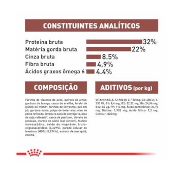 Farinha de vísceras de aves, gordura de frango, farinha de torresmo, gordura suína, ovo em pó, óleo branqueado e desodorizado de peixes, quirera de arroz, fibra de ervilha, farelo de glúten de milho 60*, fibra de soja*, polpa desidratada de beterraba, óleo de soja refinado*, casca de psyllium, óleo de microalgas (Schizochytrium sp.), levedura de cervejaria inativada desidratada, cloreto de sódio (sal comum), cloreto de potássio, fosfato monossódico, óxido de magnésio, frutooligossacarídeos (0,35%), mananoligossacarídeos (0,2%), extrato de marigold (Tagetes erecta), vitaminas (A, C, D3, E, B1, B2, B3, B5, B6, B12), biotina, ácido fólico, cloreto de colina, cobre aminoácido quelato, manganês aminoácido quelato, zinco aminoácido quelato, levedura enriquecida com selênio, iodato de cálcio, óxido de zinco, óxido de manganês, sulfato de ferro, sulfato de cobre, zeolita, sulfato de cálcio, DL-metionina, taurina, hidrolisado de fígado de aves, antioxidante BHA (butilhidroxianisol).