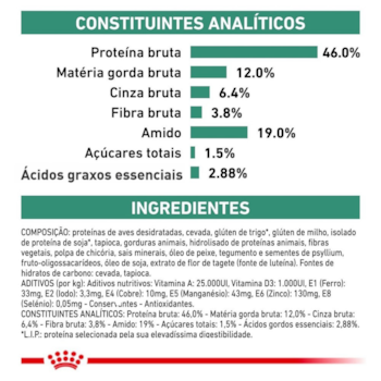 Farinha de vísceras de aves, casca de ervilha, farinha de mandioca, glúten de trigo, farinha de trigo, farelo de glúten de milho*, lignocelulose, gordura de frango, polpa de chicória seca, cloreto de potássio, fosfato monossódico, sulfato de cálcio, levedura seca de cervejaria, óleo de peixe refinado, casca de psyllium, cloreto de colina, cloreto de sódio (sal comum), extrato de marigold, hidrocloreto de glicosamina, sulfato de condroitina, Vitaminas (A, E, C, D3, B1, B2, B6, B12, PP, ácido pantotênico, biotina, ácido fólico, sulfato de ferro, sulfato de cobre, óxido de manganês, óxido de zinco, iodato de cálcio, levedura enriquecida com selênio, cobre aminoácido quelato, manganês aminoácido quelato, zinco aminoácido quelato, L- Carnitina, taurina, palatabilizante à base de fígado de frango, antioxidante (BHA).