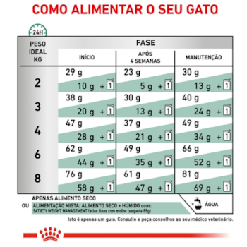 Para controlar o comportamento de solicitação por alimento, a Royal Canin incorporou à fórmula uma mistura especial de fibras naturais. Esses ingredientes proporcionam um efeito saciogênico eficaz, o que ajuda a reduzir o consumo espontâneo de alimento e mantém o gato satisfeito entre as refeições. Segundo um estudo da própria Royal Canin, 82% dos gatos que seguiram a dieta Satiety demonstraram menos insistência por comida, o que reforça a eficácia dessa formulação para o controle de fome e apoio à disciplina alimentar do felino.