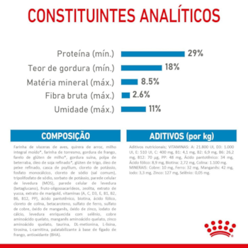 Farinha de vísceras de aves, quirera de arroz, milho integral moído*, farinha de torresmo, gordura de frango, farelo de glúten de milho*, gordura suína, polpa de beterraba, óleo de soja refinado*, glúten de trigo, óleo de peixe refinado, casca de psyllium, cloreto de potássio, fosfato monocálcico, cloreto de sódio (sal comum), tripolifosfato de sódio, sorbato de potássio, parede celular de levedura (MOS), parede celular de levedura (betaglucano), fruto-oligossacarídeos, zeolita, extrato de yucca, extrato de marigold, vitaminas (A, C, D3, E, B1, B2, B6, B12, PP), ácido pantotênico, biotina, ácido fólico, cloreto de colina, betacaroteno, sulfato de ferro, sulfato de cobre, óxido de manganês, óxido de zinco, iodato de cálcio, levedura enriquecida com selênio, cobre aminoácido quelato, manganês aminoácido quelato, zinco aminoácido quelato, taurina, DL-metionina, L-lisina, tirosina, L-carnitina, palatabilizante à base de fígado de frango, antioxidante (BHA).