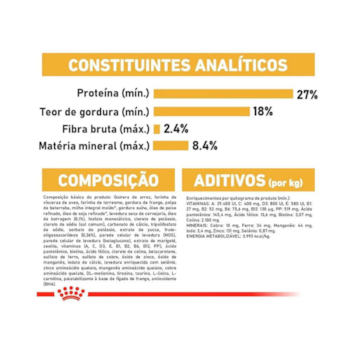 Quirera de arroz, farinha de vísceras de aves, farinha de torresmo, gordura de frango, polpa de beterraba, milho integral moído*, gordura suína, óleo de peixe refinado, óleo de soja refinado*, levedura seca de cervejaria, óleo de borragem (0,1%), fosfato monocálcico, cloreto de potássio, cloreto de sódio (sal comum), carbonato de cálcio, tripolifosfato de sódio, sorbato de potássio, extrato de yucca, fruto-oligossacarídeos (0,36%), parede celular de levedura (MOS), parede celular de levedura (betaglucano), extrato de marigold, zeolita, vitaminas (A, C, D3, E, B1, B2, B6, B12, PP), ácido pantotênico, biotina, ácido fólico, cloreto de colina, betacaroteno, sulfato de ferro, sulfato de cobre, óxido de zinco, óxido de manganês, iodato de cálcio, levedura enriquecida com selênio, zinco aminoácido quelato, manganês aminoácido quelato, cobre aminoácido quelato, DL-metionina, tirosina, taurina, L-lisina, L-carnitina, palatabilizante à base de fígado de frango, antioxidante (BHA).