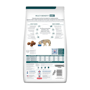 A Ração Seca Hill's Prescription Diet w/d Multi Benefit para Cachorros Adultos é um alimento coadjuvante seco para o manejo nutricional de cachorros adultos responsáveis às fibras, propensos à obesidade ou obesos, ao manejo da glucose, problemas digestivos e redução de riscos de desenvolvimento de pedras de estruvita.