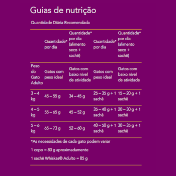 A Ração Whiskas® em sua fórmula contem nutrientes balanceados e antioxidantes que auxiliam no envelhecimento saudável, possui delicicrocs que por conta de sua estrutura crocante facilita a mastigação para gatos.