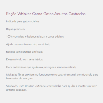 A Ração Whiskas® para gatos adultos carne é um alimento desenvolvido para gatos com alta palatabilidade para auxiliar no desenvolvimento de seu gato.
