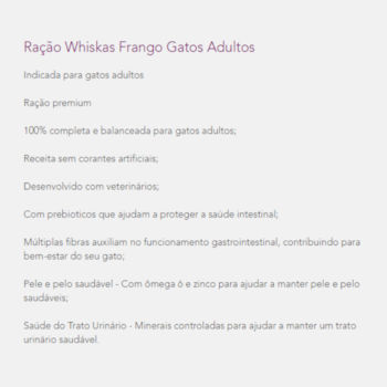 A Ração Whiskas® para gatos adultos frango é um alimento desenvolvido para gatos com alta palatabilidade para auxiliar no desenvolvimento de seu gato.