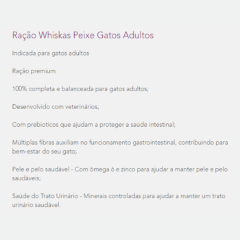 Os alimentos Premium apresentam um nível nutricional mais elevado, e atendem os requisitos mínimos estabelecidos pelo Conselho de Nutrição Animal, os níveis nutricionais devem estar em equilíbrio entre os níveis mínimos e máximos apresentados pela AAFCO (Association of American Feed Control Officials). A Ração Whiskas para gatos adultos, peixe foi produzida atendendo todos os requisitos.