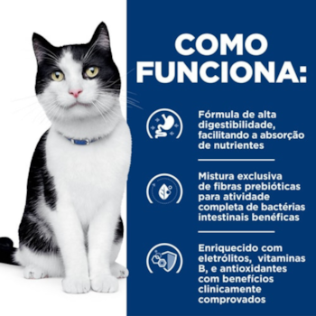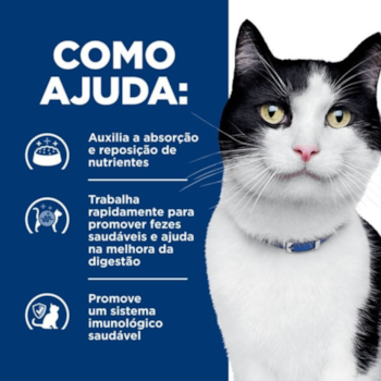 Alimento coadjuvante úmido para gatos adultos a partir de 1 ano, especificamente formulado para suporte nutricional, com fibras digestivas probióticas colaborando para qualidade das fezes, enriquecidas com eletrólitos e vitaminas B, ácidos graxos, ômega 3 e 6 e antioxidantes.