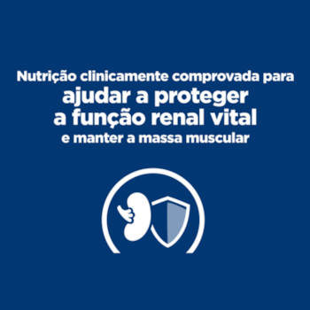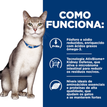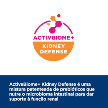 A composição inclui níveis controlados de fósforo e sódio, proteínas de alta qualidade e aminoácidos essenciais para ajudar a manter a massa muscular e o apetite, fatores importantes para gatos com função renal comprometida. A tecnologia ActivBiome+ Kidney Defense (um blend de prebióticos patenteado) atua no microbioma intestinal do seu gato e está associada à proteção da função renal vital ao longo do tempo.