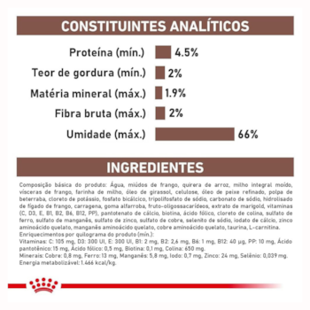 Água, miúdos de frango, vísceras de frango, quirera de arroz, milho integral moído, farinha de milho, óleo de girassol, ovo em pó, celulose, polpa de beterraba, carbonato de cálcio, cloreto de potássio, pirofosfato tetrapotássico, tripolifosfato de sódio, carragena, goma alfarroba, fruto-oligossacarídeos, extrato de marigold, cloridrato de cisteina monohidratado, vitaminas (C, D3, E, B1, B2, B6, B12, PP), pantotenato de cálcio, biotina, ácido fólico, cloreto de colina, sulfato de zinco, sulfato de ferro, sulfato de manganês, sulfato de cobre, selenito de sódio, iodato de cálcio, zinco aminoácido quelato, manganês aminoácido quelato, cobre aminoácido quelato, taurina, DL-metionina, L-carnitina.