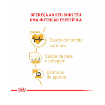 Alimento completo úmido para cães adultos e maduros da raça Shih Tzu – A partir de 10 meses de idade. A Ração Royal Canin Sachê Breed Health Nutrition para Cães Adultos Shih Tzu é formulada exclusivamente com ingredientes completos e equilibrados, apresenta ALA, EPA e DHA, visando auxiliar na saúde da pele e contribuir para a beleza dos pelos, contém nutrientes essenciais como sódio, L-carnitina, e aminoácidos como a taurina, favorecendo a vitalidade do coração, além de estimular o sistema digestório.