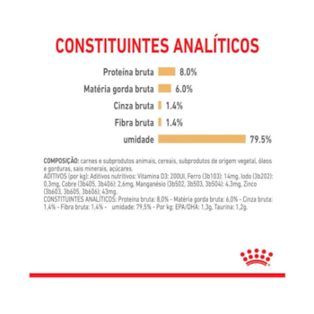 Água, vísceras de suínos, carne mecanicamente separada de frango, vísceras de frango, miúdos de frango, celulose, amido de milho, farinha de arroz, óleo de girassol, óleo de peixe refinado, plasma sanguíneo suíno, carbonato de cálcio, cloreto de potássio, óxido de magnésio, tripolifosfato de sódio, corante caramelo, carragena, goma alfarroba, goma xantana, ácido cítrico, carbonato de sódio, extrato de marigold, vitaminas (C, D3, E, B1, B2, B6, B12, PP), pantotenato de cálcio, biotina, ácido fólico, cloreto de colina, sulfato de zinco, sulfato de ferro, sulfato de manganês, sulfato de cobre, iodato de cálcio, zinco aminoácido quelato, manganês aminoácido quelato, cobre aminoácido quelato, taurina, L-carnitina.