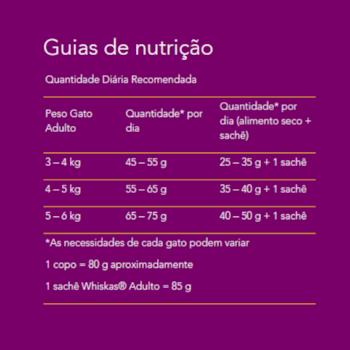 A Ração Whiskas® em sua fórmula contem nutrientes balanceados para controle e perda de peso, auxilia no trato urinário além de controle e combate a formação de bolas de pelo.