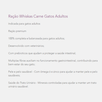 A Ração Whiskas para gatos adultos castrados carne é um alimento desenvolvido para gatos com alta palatabilidade para auxiliar no desenvolvimento de seu gato.