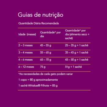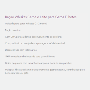 A Ração Whiskas® para gatos filhotes carne e leite é um alimento desenvolvido para gatos com alta palatabilidade para auxiliar no desenvolvimento de seu gato.