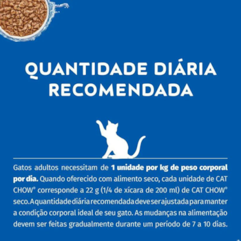 Gatos adultos necessitam de 1 unidade por kg de peso corporal por dia. Quando oferecido com alimento seco, cada unidade de CAT CHOW corresponde a 22 g (1/4 de xícara de 200 ml) de CAT CHOW seco. A quantidade diária recomendada deve ser ajustada para manter a condição corporal ideal de seu gato. As mudanças na alimentação devem ser feitas gradualmente durante um período de 7 a 10 dias.