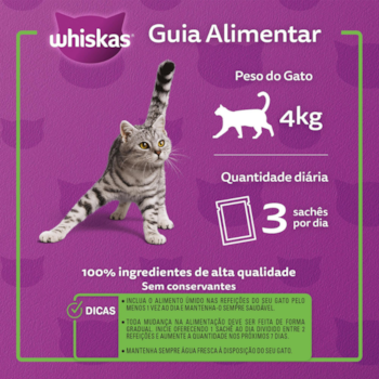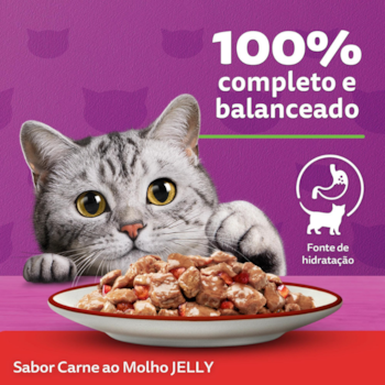 O Whiskas Sachê Jelly Carne para Gatos Adultos é uma ração úmida completa feita especialmente para gatos a partir de um ano. Ele traz pedaços suculentos de carne, cozidos a vapor, imersos em um jelly saboroso, o que torna a refeição apetecível e de fácil ingestão. Como ele contém cerca de 82% de umidade, auxilia bastante no equilíbrio hídrico do animal, o que é importante para evitar problemas urinários.